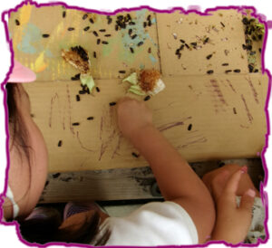と小さい種を欠けたチョークのように器用に持ち、段ボールに線を書き始めました。黒い種からなぜか紫色の線が欠けていました。(ふしぎやなぁ…)よく見ると、種を花から掻きむしっていた手は紫色になっていました。