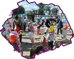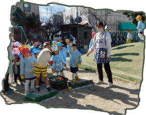 そのあと、寒さを吹き飛ばして子オニ達が元気になるよう体操をしたり、マラソン、玉投げ・平均台、大縄などで異年齢混じって遊びました。